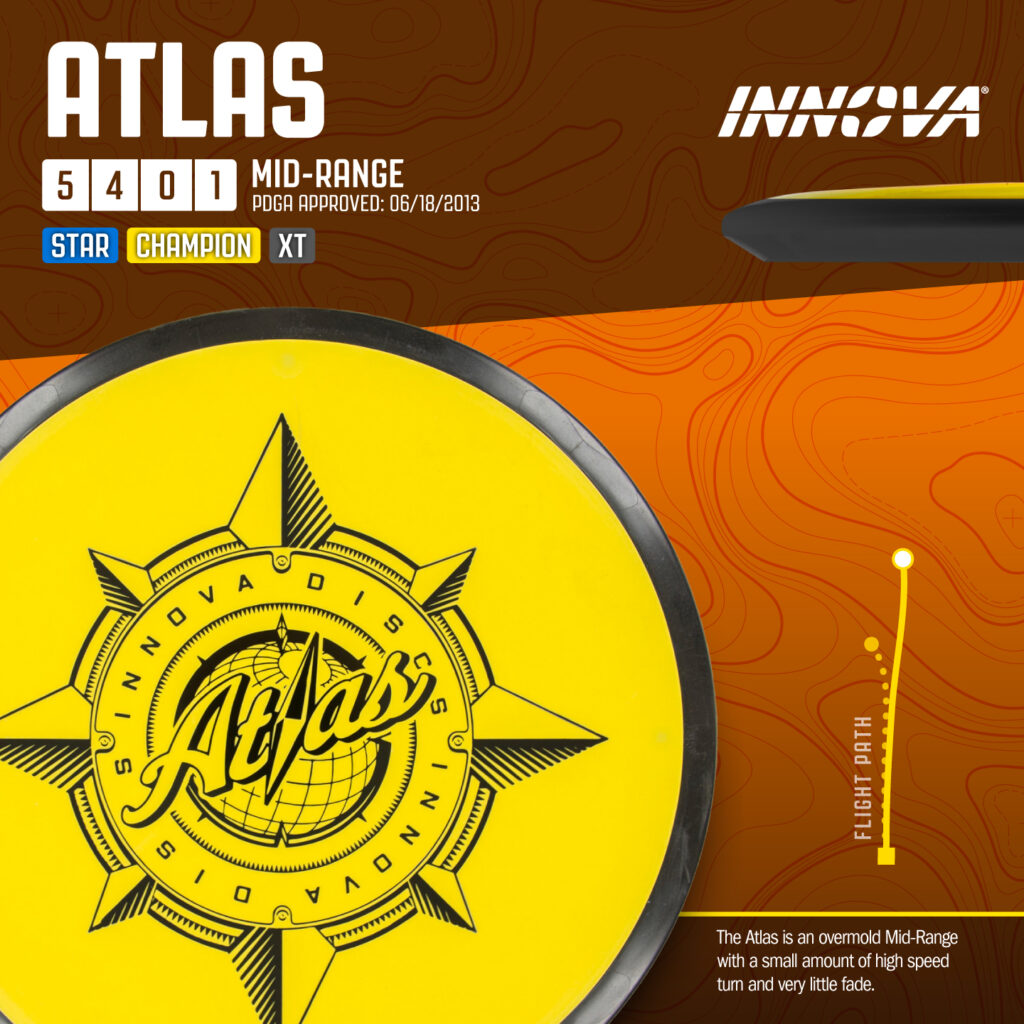 The Avatar is another of Innova’s overmold Mids. For players who like the feel of the Atlas, the Avatar is just a bit more overstable and torque-resistant. It is a great straight-flier for forehands.