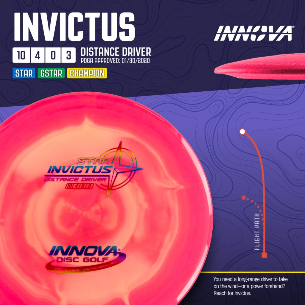 The Invictus fills a neglected spot in many players’ bags – an overstable disc, slower than an XCaliber, but faster than a Firebird. Great for headwinds, spike hyzers, and scrambling. Garrett Gurthie says if you’ve got the power, this is a must-have mold.